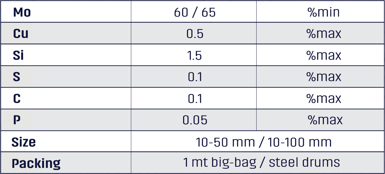 Ferro Molybdenum is one of the main products used in the molybdenum alloying of High Strength-Low Alloy (HSLA) Steel. During alloying with steel, ferro molybdenum is used by adding it to the molten steel before casting, which makes the steel extremely strong and increases the corrosion resistance of the product.