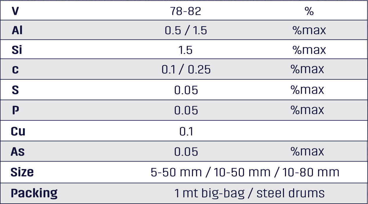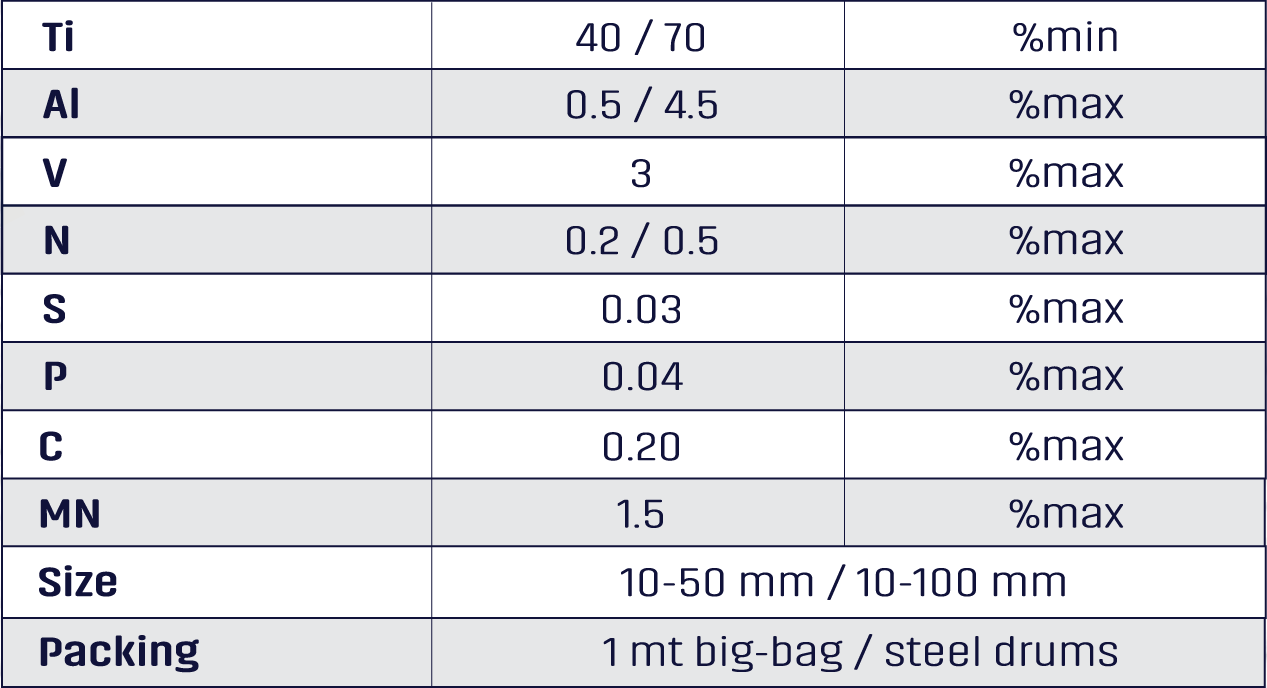 Ferro Titanium is a product used in steel production and acts as a cleaning agent in iron and steel. Titanium; It becomes highly reactive with sulfur (sulphur), carbon, oxygen, and nitrogen (nitrogen), forming insoluble compounds, enabling ionization in the slag, and is therefore used for deoxidation, and sometimes desulphurization and denitrification. Steel manufacturers also use Ferro Vanadium as a stabilizer. The main applications for Ferro Titanium include; 1- Cleaning Agent used for deoxidation, desulfurization and denitrification. 2- Cleaning Agent used for deoxidation, desulfurization and denitrification.