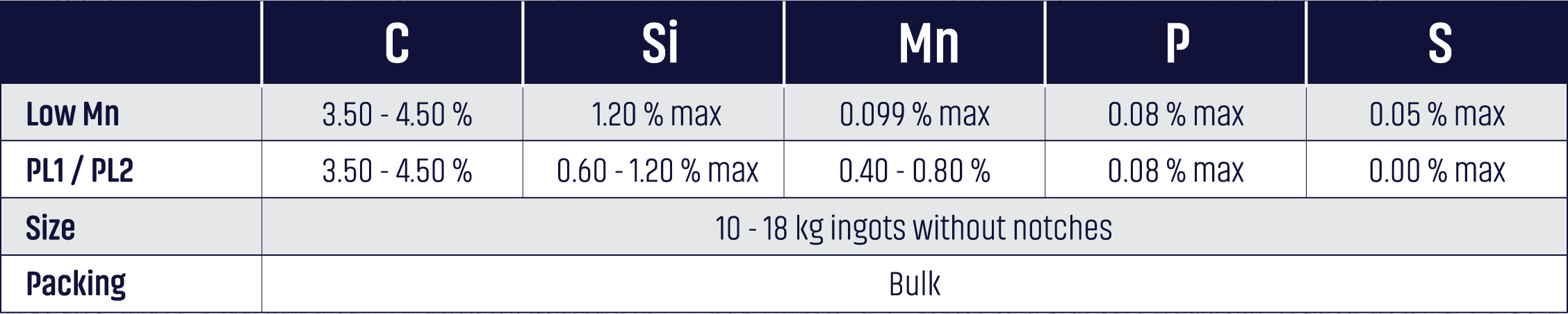 Cast Iron (also known as Heametite Pig Iron) is used in Gray Iron Casting in cupolas and induction furnaces.